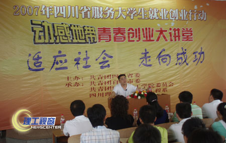 6月23日下午,由共青团四川省委主办,共青团自贡市委、共青团四川理工学院委员会、机电工程系承办的以“适应社会、走向成功”为主题的“2007年四川省服务大学生就业创业行动青春创业大讲堂”的大型专题讲座在汇南404教室举行。此次报告会应邀而来的是原四川轻化工学院化工机械系81级校友、现禾嘉股份有限公司总经理樊平先生,团市委书记曹友良、副书记杨斌、院团委王建琼书记等出席参加了报告会。