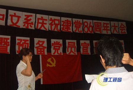 2007年6月19日上午,中文系党总支举行了庆祝建党86周年暨新党员宣誓大会,中文系全体党员和部分入党积极分子代表参加了大会。