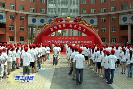 7月13日下午,四川理工学院隆重举行2007年暑期“三下乡”社会实践活动出征仪式。学院党政领导李开世、邓起方、钱维新,学院相关职能部门负责人,共青团自贡市委书记曹友良、副书记万春霞,以及大安区委副书记高小林、共青团大安区委书记刘勇、大安区妇联主任黄显容等出席了出征仪式,仪式由院团委副书记王建琼主持。