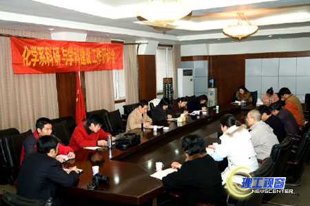 2008年1月7日上午,化学系“学科建设与科研工作研讨会”在营盘校区办公楼二会议室举行。此次研讨会的目的是为了总结近年来化学系在学科建设、科研工作取得的成绩和成功经验,找出存在的问题和薄弱环节,明确努力的方向。出席研讨会的有学院副院长龚敏、蔡乐才,研究生处处长李可彬、科技处邓静科长及化学系具有博士学位教师、系科级以上干部、教研室主任、实验中心主任等。