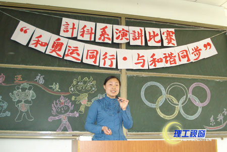 为迎接2008北京奥运,展现当代大学生的风采。4月16日下午,计科系在汇南104教室举办了“和奥运同行,与和谐同步”的演讲比赛。本次比赛特别邀请到了院党委宣传部副部长周红蕾老师担任评委,系党总支副书记肖强老师、系团总支书记张潇文老师、系学工办杨晶老师、演讲公关社负责人、文学社负责人等出席了本次比赛并担任评委。