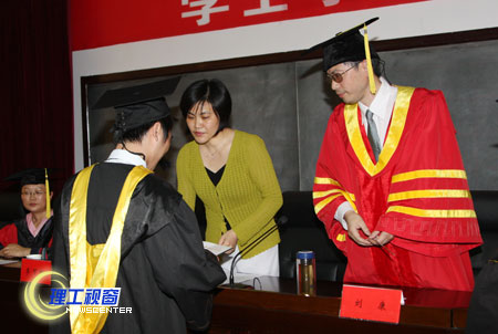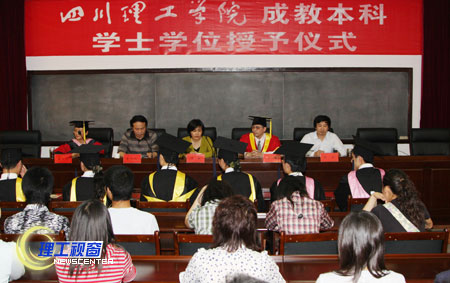 仪式在庄严的国歌声中拉开了序幕。学院副院长龚敏宣读了《四川理工学院关于授予2008届成人高等学历教育本科毕业生蒋达全等9位同学学士学位的决定》。学院副院长龚敏、刘康亲自为毕业生颁发了证书并为他们扶流苏。