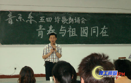下午2:30,以"青春与祖国同在"为主题的诗歌朗诵会在2-214展开。同学们饱含深情地朗诵了《青春之歌》、《祖国啊,我亲爱的祖国》、《五四中国心》、《祖国万岁》、《人民的世纪》等赞美青春,歌颂祖国的诗歌,淋漓尽致地表达了同学们爱国的情感和青春的激情。系领导专门到朗诵会现场对同学们表示节日的祝福。