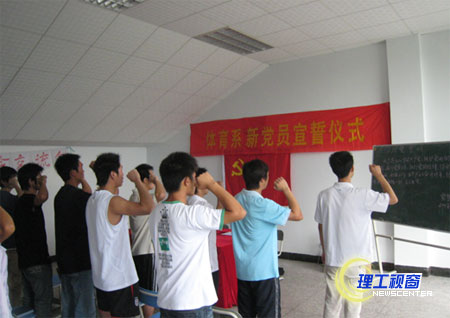 2008年6月11日,体育系学生党支部举行了入党宣誓仪式,体育系直属党支部曾玉琴书记、学工办主任李坚老师、辅导员黄辉老师和全系所有学生党员和入党积极分子共50多人参加了入党宣誓大会,本次大会有李坚老师主持。