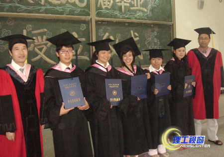 发言结束后,外文系党总支书记廖国强、系主任夏宏钟、副主任云虹、导师刘川教授身着导师服亲自为符合学士学位授予条件的08届本科毕业生颁发了证书并为他们扶流苏。毕业生们身穿学士服,愉快地从导师手中接过了学位证书,留下了最美好的时刻。