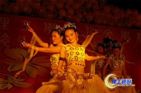 晚会在舞蹈《梦回敦煌》中拉开帷幕,现场书画诗朗诵《秦风》、舞蹈《高原红》等节目陆续展开。话剧《折断的翅膀》表现了一个农村学生求学途中的曲折,现代舞《DANCER》把现场的气氛带到了高潮,黄梅戏《对花》为大家展示了戏曲的独特魅力,合唱《爱因为在心中》表达了5.12大地震中生死不离的爱,相声《一毛钱》诙谐幽默赢得现场掌声阵阵,哑剧《考试》精湛的演技和夸张的表演逗得师生笑声连连。最后晚会在一曲《我们的生活多么美好》中落下了帷幕。