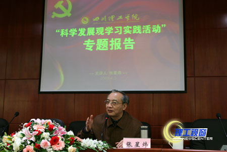4月3日下午,我校在汇东校区学术报告厅举行了深入学习实践科学发展观活动专题报告会,中共四川省委党校知名教授张星炜应邀作了专题报告。院长曾黄麟,党委副书记唐健禾、李开世,副院长刘康、蔡乐才,全校副处级以上干部(含调研员)、离退休党员代表、教职工党员代表、学生党员代表参加了会议。会议由副书记唐健禾主持。