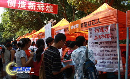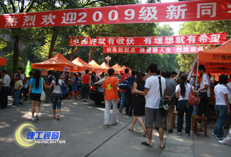 金秋橙黄,丹桂飘香。8月31日——9月1日,我校迎来了2009级新生。截止今日下午4时,已有来自全国各地的近6000名新生陆续来到我校。平日宁静祥和的校园,沉浸在了一片温馨欢乐的海洋里,处处横幅高挂、彩旗招展,显得格外热烈、喜庆。