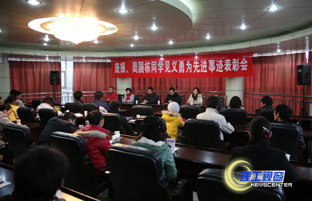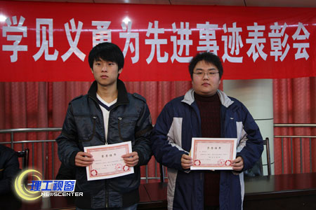 11月18日下午,学校在行政楼3楼会议室举行表彰会,专门对我校学生庞振、周国栋同学的见义勇为先进事迹进行表彰。