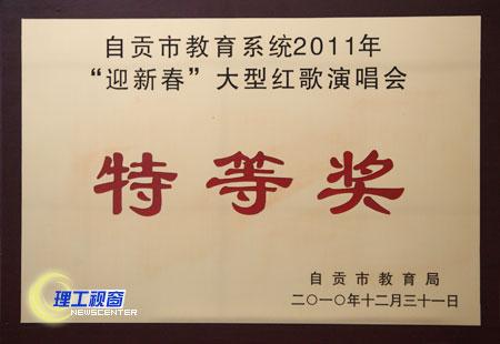 1月10日下午,在自贡市教育局六楼会议室召开了“2011年迎新春红歌演唱工作总结会”,表彰“红歌会”优秀团队并颁奖。艺术学院代表队以良好的专业素养和精彩的表演获得特等奖。