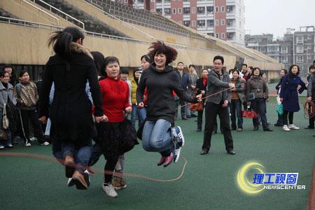 3月9日下午,学校在汇东校区操场举行“三八”妇女节多人跳绳比赛。比赛以分工会为小组,全校20个分工会分为20个小组参加了比赛。比赛的参与者除了女职工外,每组允许2个男职工参与到其中。每个小组2人甩绳,其他人跳绳,由跳绳人数的多少来决定比赛胜负。