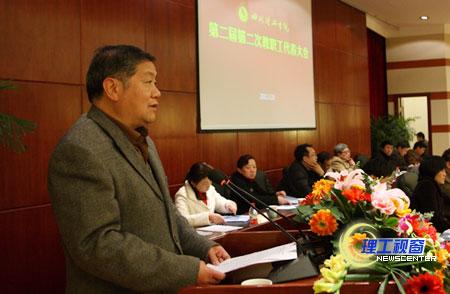 3月23日下午,我校第二届教职工代表大会第二次会议在汇东校区学术报告厅隆重举行。学校党政领导游建军、曾黄麟、唐健禾、李开世、龚敏、刘康、王成端及大会主席团成员在主席台就座。出席本次大会的正式代表共有144名,列席代表23名。大会由党委副书记、工会主席唐健禾主持。