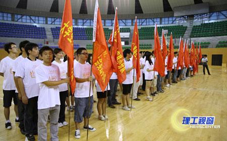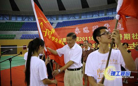 随后,学校领导为社会实践团队授旗。一面面鲜艳的社会实践旗帜,舞动着各团队的朝气与活力。同学们踌躇满志,决心在社会实践的大舞台上演绎出青春的光彩。