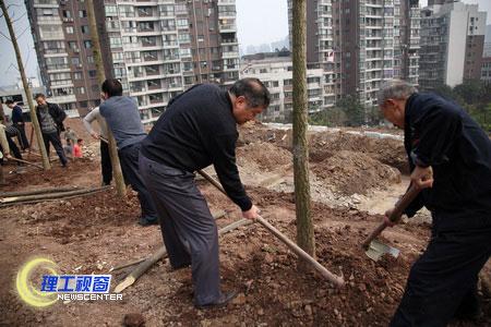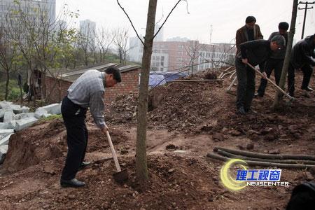 学校领导手拿锄头、铁锹等工具来到植树地点,与后勤总公司的绿化工人一起种下了20棵银杏树,并为树木培土、浇水。