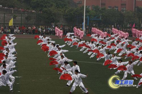 运动员、裁判代表分别宣誓,将本着“友谊第一,比赛第二”和“公平、公正”的原则参加比赛。随后,体育场上2000多人组成的大型团体操表演闪亮登场,为全校师生献上了精彩纷呈的太极排舞、功夫扇、华尔兹和啦啦操组成的团体操表演。矫健优美的舞姿,整齐划一的动作,形象生动的造型激起了全场欢声雷动。团体操融歌曲、舞蹈、武术和体操于一体,表现了由《绚丽青春》、《厉兵秣马》、《畅想理工》、《魅力飞扬》四幕结构的宏伟主题,象征着我校师生振奋精神、鼓足干劲、坚定不移地继续推进四川理工大学建设的豪迈激情和开拓精神。