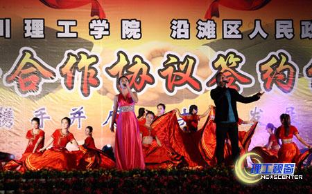 签约仪式结束后,我校艺术学院师生为沿滩区人民带来了一场题为“携手并肩、共推发展”的庆祝演出活动。男声独唱《在那桃花盛开的地方》、诗歌《沿滩颂》、舞蹈《溜溜的康定、溜溜的城》、女声二重唱《祖国万岁》、女声独唱《春天的芭蕾》、啦啦操《龙舞春华》、萨克斯曲《望春风》、男女声二重唱《阳光路上》等精彩节目引发全场阵阵掌声。