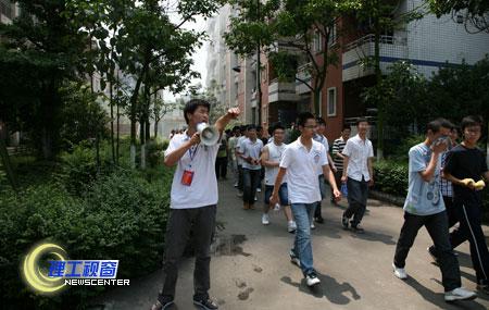 5月9日13:59 分,一股浓烟从汇东校区学生公寓4、7栋冒出,14:00清脆嘹亮的紧急集合号从学校广播中紧急发出,随即,师生们开始迅速有序地从办公楼和学生公寓里紧急向外疏散……其间,四名同学用担架抬着一名“伤者”从学生公寓7栋迅速送往早已等候在食堂旁边的救护车,医务人员立即对伤者进行了急救包扎。