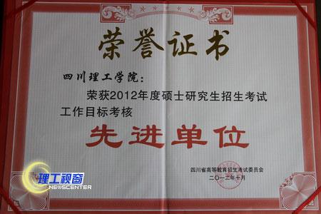 我校在2012年的研究生招生考试工作中严格按照《四川省2012年硕士研究生招生考试目标责任书》的要求,高度重视考风考纪和试卷(答卷)的安全保密工作,认真落实目标责任,措施得力,管理到位,顺利完成了2012年度全国硕士研究生招生考试工作任务,荣获“四川省2012年度硕士研究生招生考试工作目标考核先进单位”。