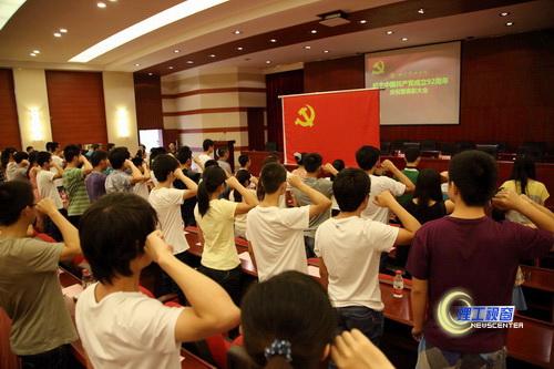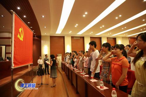 会议在庄严的国歌声中拉开帷幕。在领誓人、党委常委、副院长龚敏的带领下,104名新党员代表胸佩党徽、高举右手,站在鲜红的党旗下庄严宣誓。