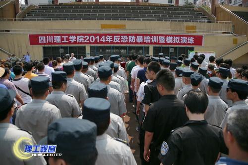 为了进一步强化校园安保工作,增强学校处置突发事件的能力,6月18日下午,学校在汇东校区运动场举行反恐防暴模拟演练,并特邀自贡市公安局反恐处、特警支队、学苑街派出所的民警为保卫处全体人员和学校各部门、各二级学院的安全员以及学生治保干部代表进行了模拟演练培训指导。副院长肖兴政和学生处、团委、后勤总公司、图书馆负责人出席了模拟演练现场。