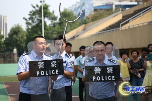 在活动现场,学苑街派出所副所长朱驰向全体参演人员详细介绍了如果遇到暴徒进入校园时应该采取怎样的处置办法和应对措施。他说:“一旦遇到暴徒进入校园,首先是报,即立刻报警,寻求公安机关的支援,同时立即向单位领导汇报;其次是保,即保护好自己和师生的人身安全,迅速疏散学生撤到安全地带,找到安全位置后再寻找工具,在保障安全的情况下进行对抗。”随后,朱驰与市公安局反恐处办公室副主任段松、特警支队二大队大队长周志刚一起,为大家现场演示了盾牌、钢叉、警用棍、辣椒水、网枪等反恐防暴工具的使用方法及安保人员应采取的各种防备办法。