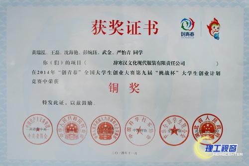 近日,由共青团中央、教育部、人力资源和社会保障部、中国科协、全国学联、湖北省人民政府主办,工业和信息化部、国务院国有资产监督管理委员会、中华全国工商业联合会支持,华中科技大学、共青团湖北省委、武汉东湖新技术开发区承办的2014年“创青春”全国大学生创业大赛终审决赛在华中科技大学落下帷幕。最终,我校黄瑞泓、王磊、沈海艳、彭婉珏、武金、严怡青同学的作品《辞寒汉文化服装有限责任公司》获得了铜奖的优异成绩。