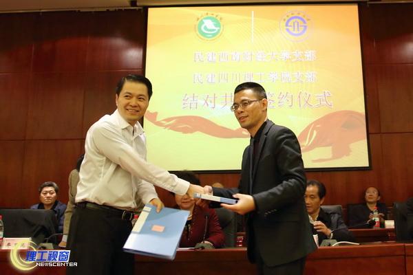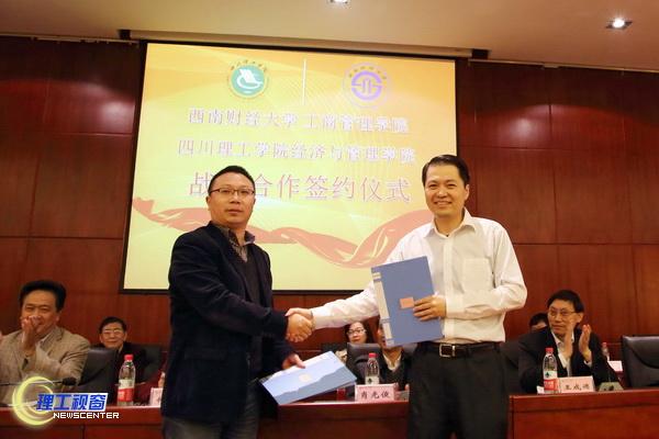为推进民建基层组织建设,提高履职水平,4月10日下午3:00,民建四川理工学院支部与民建西南财经大学支部在学术报告厅签订友好合作协议。同时,为加快我校二级学院学科建设,提高科学研究水平和人才培养质量,我校经济与管理学院与西南财经大学工商管理学院签订战略合作协议。签约四方将在学术研讨、项目咨询、科学研究、人才培养、师资建设等方面进行深度合作,力求资源共享、优势互补,为地方经济社会文化发展提供智力支持。