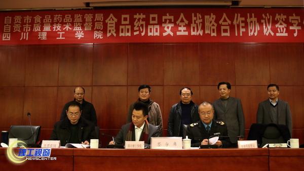 出席并参加签约仪式的还有:自贡市人大党组副书记、副主任王建威,自贡市政协副主席徐武斌,42家食品及食品相关产品生产企业负责人,市药监局、质监局的相关工作人员以及我校生工学院、服地处、科技处等相关部门的负责人和师生代表。会议由自贡市人民政府副秘书长许建平主持。