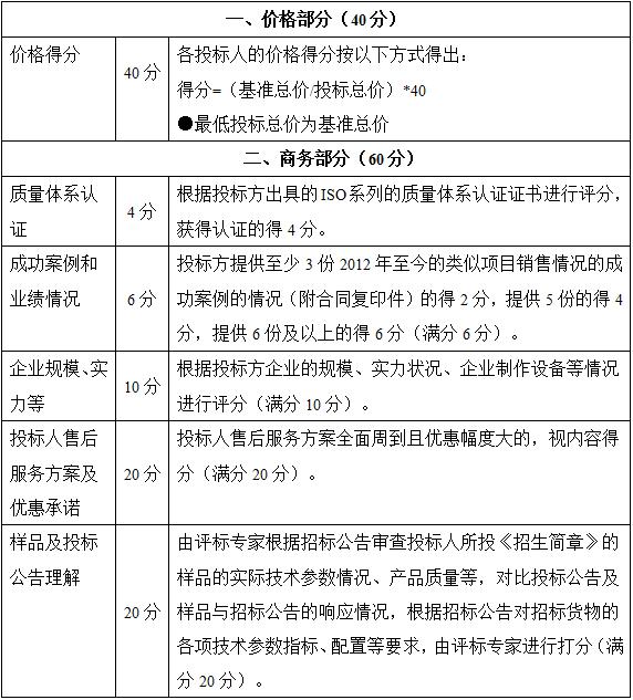 本次评标采用综合评分法,总分为100分,其中价格部分40分、商务部分60分。投标人评标综合得分=价格部分得分+商务部分得分。
