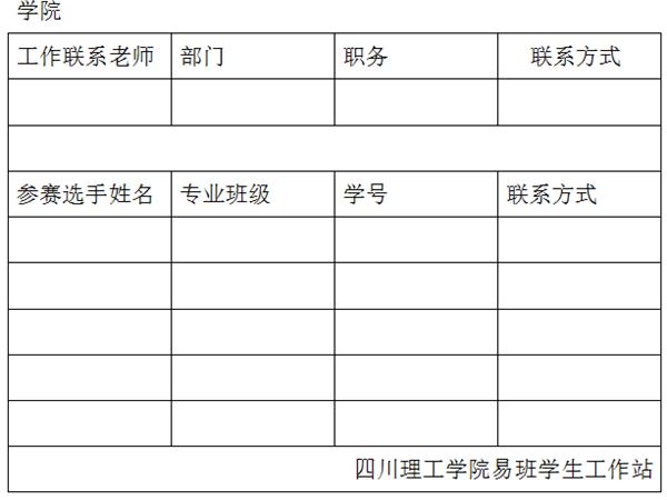 各参赛单位需于4月22日12:00前将5名参赛学生名单(姓名、学院、专业班级、学号、联系电话)、工作联系教师(姓名及电话)通过OA发送至校团委许筠柱(联系电话:0813-5506232)。
