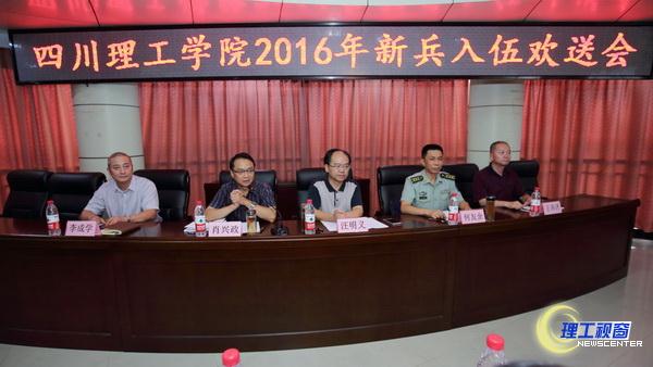 78名应征入伍的学生胸戴大红花,精神抖擞,斗志昂扬。他们即将离开校园,踏入绿色军营开启新一段人生旅程。9月13日下午,我校在汇东校区行政中心举行2016年新兵入伍欢送会,党委书记汪明义、自贡市自流井区人民武装部部长何友余出席会议并讲话,副校长肖兴政主持会议。