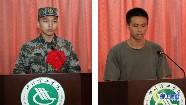 新兵代表轻化工程专业2015级学生冯建强在会上发言,感谢母校的培养,表示将时刻铭记“勤奋求实,艰苦奋斗,无私奉献,校兴我荣”的黄岭精神,到部队后刻苦训练、努力学习、遵守纪律、服从领导、团结同志,绝不辜负祖国和人民的期望。老兵代表管理科学与工程专业2016级研究生唐印龙在会上发言,讲述了自己从一名在校大学生到优秀士兵,再到硕士研究生的成长过程,他说,在军队这个大熔炉中,会学到许多社会和家庭学不到的东西,是一辈子的宝贵财富。希望同学们到部队刻苦训练,达成心愿,早日立功受奖,做最可爱的人。