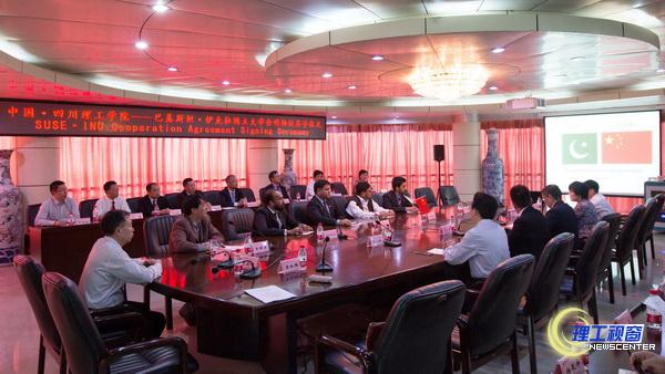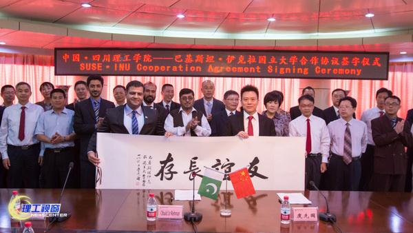 党委书记王洪辉代表学校在签约仪式上致辞。他指出,我校与巴基斯坦伊克拉国立大学合作协议的签订是学校发展中的一件大事。四川理工学院始终坚持开放办学战略,注重加强国际交流合作,学校具有良好的国际交流合作基础和较强的国际交流能力。近年来,学校不断加强对外交流,与美国、英国、日本、德国、韩国、澳大利亚等国家的大学、教学机构建立了合作交流关系,为学校的国际化发展奠定了坚实的基础;学校每年都会邀请国外专家学者来校讲学、开展学术交流活动、科学研究和联合培养,有力推动了学校开放办学力度。他希望双方本着合作共赢的基础,同舟共济,为四川理工学院和伊克拉国立大学的教育增添光彩。