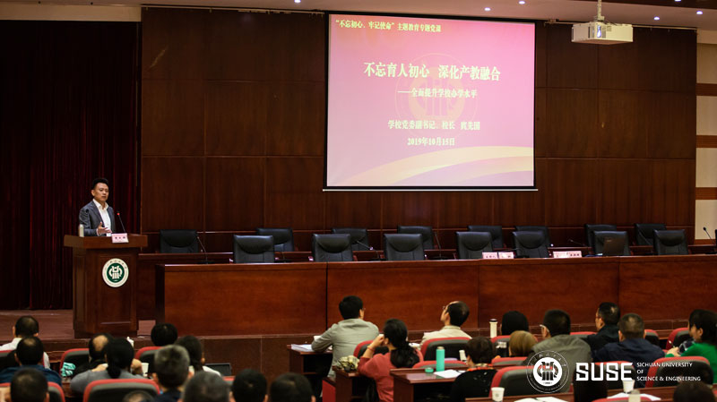 庹先国校长强调,对于学校而言,如何扎根四川主战场,加快推进地方本科高校转型发展,深化产教融合、校企合作?这是学校发展亟待思考的问题。希望全体党员干部切实提高抓落实的能力,关键是要练好四项本领:一要练好善学的本领;二要练好善谋的本领;三要练好善作的本领;四要练好善斗的本领。深入学习贯彻习近平新时代中国特色社会主义思想,开展好主题教育,关键是要把握好“守初心、担使命、找差距、抓落实”这个总要求,瞄准根本任务,锁定具体目标,落实重点措施,务求明显实效。学校将致力于研学结合、产教融合的发展思路,着力把学校的优势与地方经济社会发展进行有效契合,着力为学校长远发展、实力提升提供有力支撑。同时,学校紧紧围绕特色发展这条主线,以培养更优秀的人才,更好地服务于社会的需求。党员干部要以此次主题教育为契机,以扎扎实实的理论学习成效筑牢政治思想根基,切实推动各项工作,切实答好四川轻化工大学转型高质量发展的时代考题,为加快建设特色鲜明、优势突出的高水平大学作出新的更大贡献。