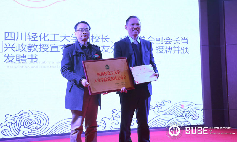 副校长、校友总会副会长肖兴政教授宣布人文学院成都校友分会正式成立,并为校友会授牌,为朱真祥颁发创新创业导师聘书。