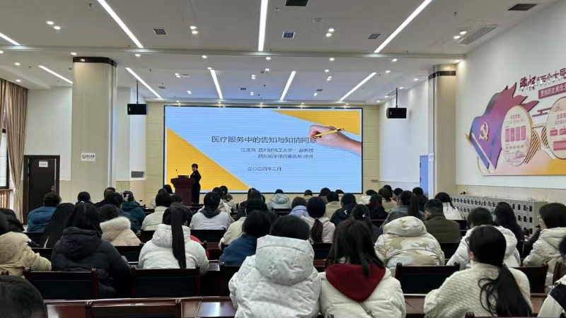2 月 7 日,法学院副院长江凌燕为自贡市第五人民医院医务人员开展了题为“医疗服务中的知情同意与告知”专题讲座。通过大量实际案例,全面且深入浅出地讲解了知情同意与告知的含义、内容、注意事项以及告知义务的免除等。江凌燕强调,对患者知情同意权的尊重与保障是确保医疗质量和安全的重要要素,医护人员应当充分告知患者包括病情、治疗方案、风险、医疗费用等在内的相关信息,且告知应当真实、准确、完整,避免使用过于专业的术语,同时要关注患者的心理状态和需求。