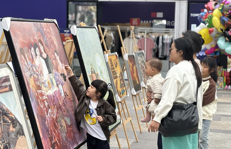 5月2日,在美术学院副院长、民俗灯文化普及基地副主任梁川教授带领下,师生志愿者一行9人到自贡市自流井区梵华商业综合体送画展到劳动者身边,五十余件美术和设计作品摆放在商业综合体入口处的市民广场上,吸引了来此购物和就餐的市民驻足欣赏。