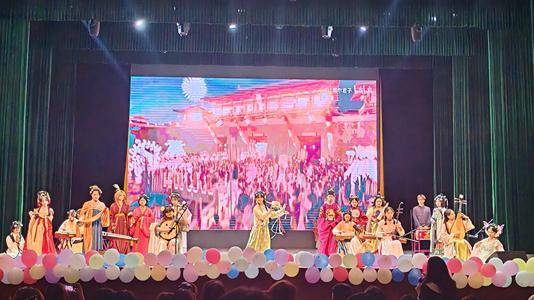 晚会在一曲悠扬的民乐合奏《山中人兮芳杜若》中拉开帷幕,汉服走秀优雅登场,宛如古风中走来的翩翩君子与佳人,展现了华夏服饰的独特魅力。铿锵激昂的朗诵《祖国在上》和中外学生共同演绎的朗诵《月光下的中国》,让观众深刻感受到了祖国山河的壮美与中华文化的博大精深,激发了师生们对祖国的深深热爱。