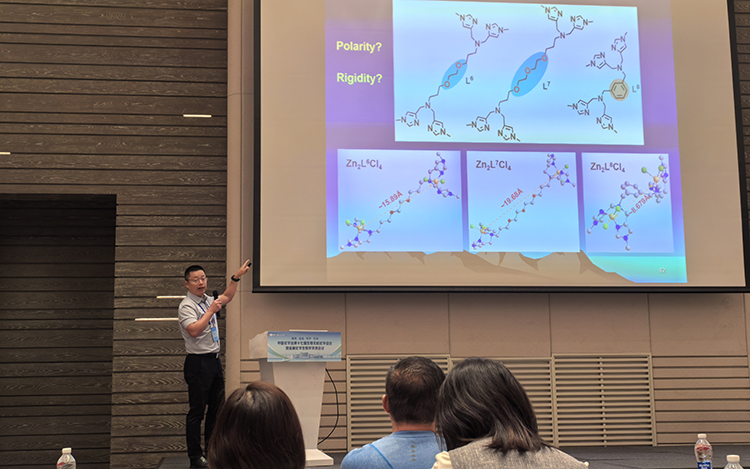 蒋维东教授的报告围绕包含环糊精、葫芦脲、杯芳烃在内等不同主体分子的引入对带不同联接基的双三齿咪唑衍生物双核金属配合物催化RNA模型物HPNP酯转移活性的影响进行了阐释。研究发现,不同空腔结构的主体分子对双核金属配合物具有选择性包结作用,从而选择性促进联接基结构适宜的双核金属配合物构象发生变化,双金属间距达到协同范围,配合物催化活性获得2个数量级提升。同时,高底物浓度下并未出现类似天然酶的底物饱和趋势,而呈现有趣的钟形变化趋势。通过1D/2D核磁表征、分子对接、对照实验等判定其可能缘于主体分子对底物HPNP结构中2’-羟丙基单元竞争性包结,从而驱动先前被包结的配合物联接基部位去包结化,双金属协同消失导致的活性明显下降。同时,预测了主客体调控惰性催化剂活性策略可应用于其它类型的催化反应。