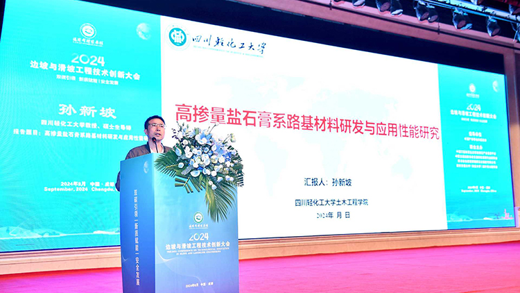 在大会上,孙新坡教授作了题为《高掺量盐石膏系路基材料研发与应用性能研究》的报告,介绍了盐石膏作为制盐工业固废,因高盐含量和碱性导致环境污染的挑战,尤其自贡市的卤煮工艺加剧了氯离子污染。针对排放量大、资源化利用率低等问题,孙教授通过引入硅酸钠、电石渣和矿渣,研发了两种高掺量盐石膏路基材料,并展示了其应用效果。他强调,边坡防护是工程建设的重要部分,科研人员应响应“生态优先、绿色发展”战略,以技术创新提升防护工程治理水平。