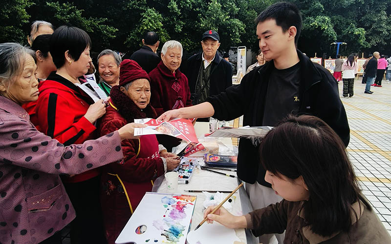 为普及宣传彩灯文化知识,民俗灯文化普及基地组织“彩灯设计与文化传播协会”学生社团在活动现场举办了“砥砺奋进 筑梦同心——庆祝中华人民共和国成立75周年美术作品展”,向群众分发彩灯文化宣传单300余份。美术学院学生社团——“大学生艺术协会模特队”为前来参加活动的群众带去了《蓝韵悠长 华彩乐章》扎染服装秀。两名研究生现场绘制团扇,向群众赠送中国画团扇120把。美术学院两个学生社团共20名同学参加了本次宣讲活动。