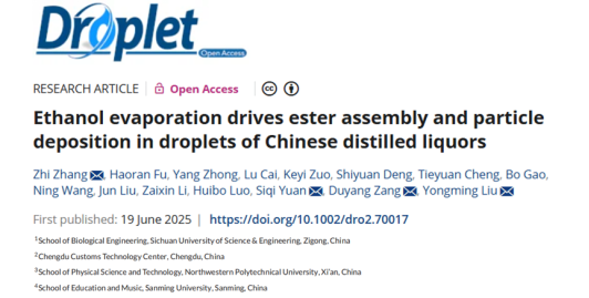 论文链接:https://doi.org/10.1002/dro2.70017 (Zhang Z, Fu H, Zhong Y, et al. Ethanol evaporation drives ester assembly and particle deposition in droplets of Chinese distilled liquors. Droplet. 2025: e70017. )