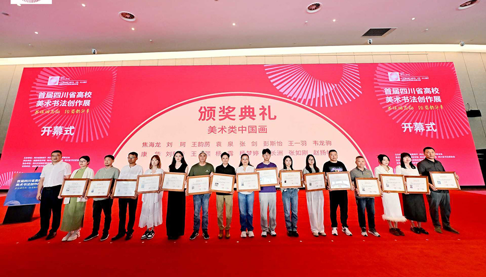 9月27日,由四川省教育厅和四川省文学艺术界联合会共同主办的“首届四川省高校美术书法创作展”在广汇美术馆开幕。此次征稿和展览以“书强国志向·绘蜀韵华章”为题。主办单位收到全省高校师生投稿作品近3000件。我校美术学院美术学系师生15人获奖,其中一等奖3项、二等奖4项、三等奖3项、优秀奖5项,展现出美术学系雄厚的专业教学和艺术创作实力。
