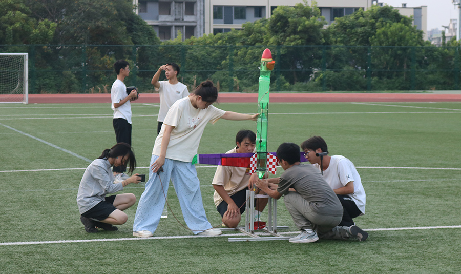 一次试飞中,水火箭挂上高树,唯一的控制芯片悬在枝头。队员们分工协作——男生爬树、绑竹竿、女生指挥方位,花了两个多小时终于“救回”设备。“没人抱怨,只有人说‘修好再试一次’。”朱宇豪说,“这就是我们的凝聚力。”
