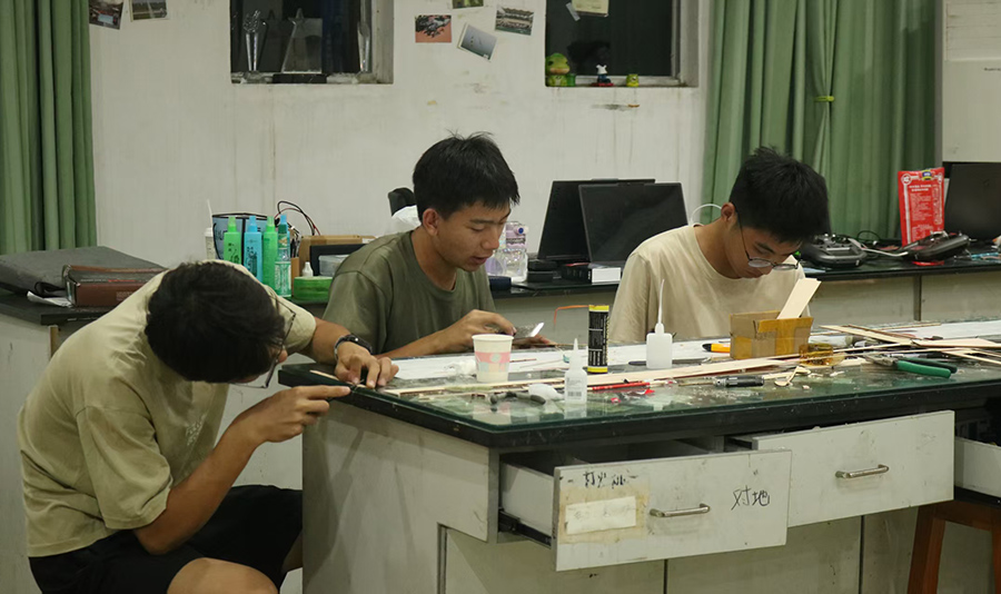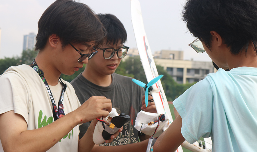 “训练时间只有三周,前期买的飞机十分钟就炸机。”队长朱宇豪笑称,“后来我们干脆自己设计,我从早上10点干到第二天凌晨5点,画图画到手软。”