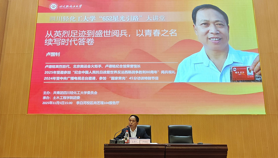 11月5日下午,我校土木工程学院“652星光引路”大讲堂在李白河校区顺利举行。活动特邀卢德铭烈士后代、卢德铭纪念馆荣誉馆长卢国钊先生担任主讲,学院党委书记朱德珍、学工办副主任白宇及200余名师生共同参与。