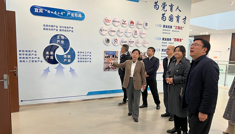 11月14日,教育部高校学生司就业指导处处长詹清华、四川省教育厅二级巡视员付军、四川省高校学生信息咨询与就业指导中心主任李胜利、宜宾市人民政府副秘书长谢艳兵等一行莅临我校宜宾校区,实地调研就业指导中心建设与毕业生就业工作情况。我校党委副书记陈范华陪同调研。