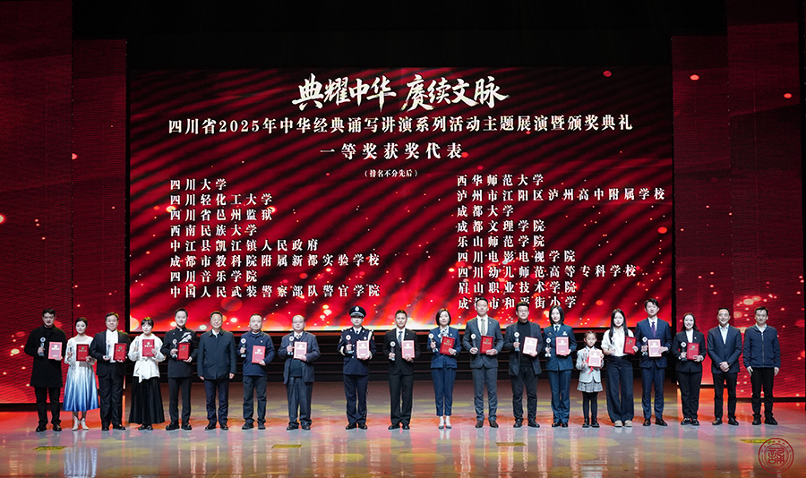 11月28日,由省委宣传部、省委教育工委、教育厅等多部门联合主办的四川省2025年中华经典诵写讲演系列活动颁奖典礼在成都大学举行。本次活动以“典耀中华•赓续文脉”为主题,吸引了全省各地学校广泛参与。