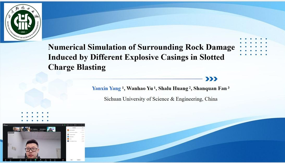 我校土木工程学院教师杨彦鑫应邀参会,并在线作了题为“Numerical Simulation of Surrounding Rock Damage Induced by Different Explosive Casings in Slotted Charge Blasting”(切缝爆破中不同药包外壳对围岩损伤的数值模拟)的学术报告。报告就切缝爆破对围岩的损伤开展讨论,基于有限元软件分别构建单孔和双孔数值模型,研究不同材质药包外壳对爆破能量传递及围岩损失的影响机制,为优化药包外壳材质选择及爆破设计提供理论依据和现场参考。