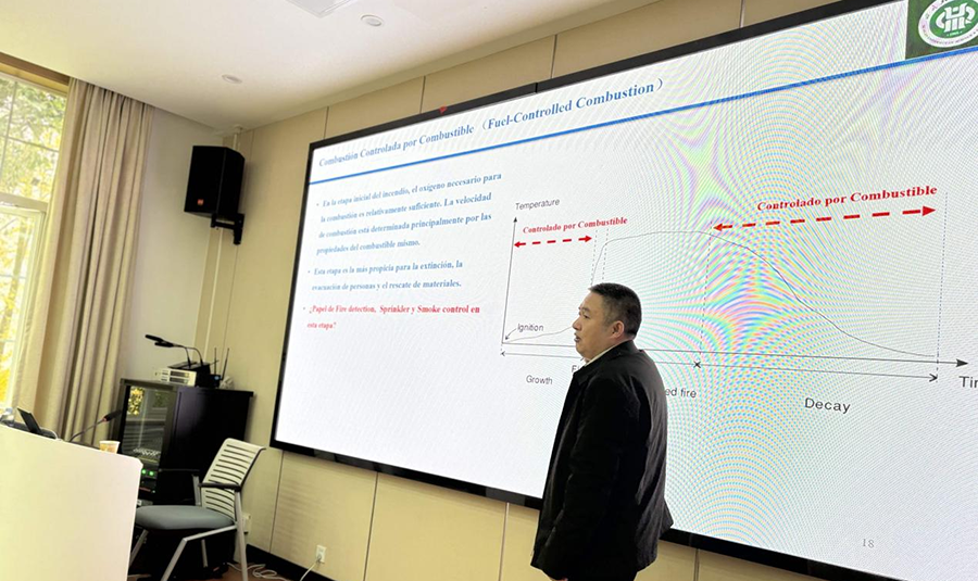林鹏以《室内及隧道火灾燃烧机理与灭火技术》《特殊空间火灾场景与扑救策略》为主题授课。结合其在大型地下工程、城市综合体及特殊建筑消防设计中的国际工程经验,深入解析封闭及半封闭空间火灾的演化规律、烟气流动特性与灭火技术选择原则,并通过典型案例分析,使学员充分理解我国在城市火灾防控与灭火技术领域的发展与实践。